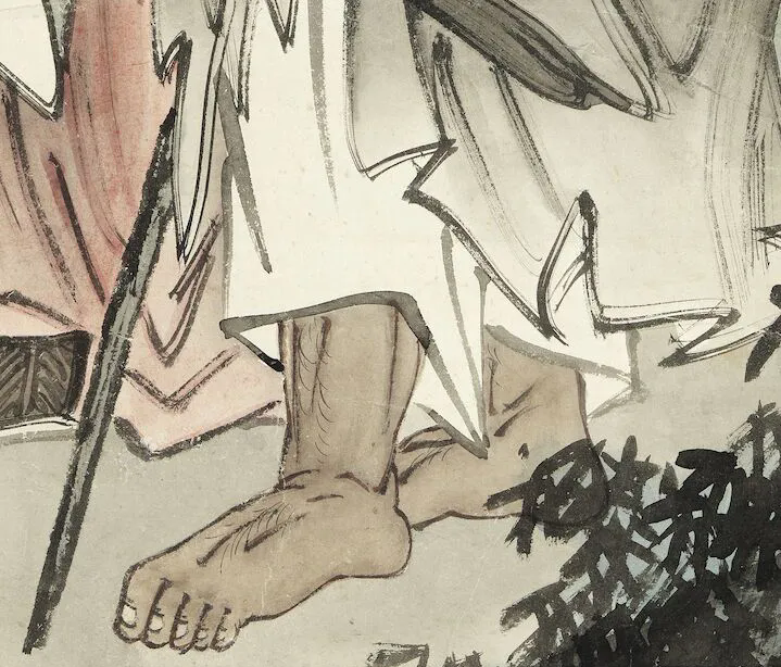 画面中,两位仙人形象栩栩如生。其用笔细腻而灵动,线条流畅自然,将仙人的衣袂飘飘之态展现得淋漓尽致。衣纹的勾勒富有变化,或舒缓或转折,仿佛能让人感受到微风拂过,衣衫随风舞动的韵律。色彩的运用上,虽无浓艳之色,却以淡雅的色调营造出一种空灵、超凡的氛围,恰似仙人的不染尘俗。